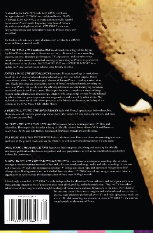 The book THE VAULT chronicles all the important events in Prince/The Artist‘s life and career. Taking the form of a year-by-year diary, it provides an exhaustive record of releases, recording sessions, concerts, TV appearances, interviews, etc. Parts of the book were previously published in 1990 and 1993 as Prince: A Documentary and in 2000 as UPTOWN Presents: Days Of Wild. This new edition has been completely revised, rewritten and fully updated to include all minor and major events until the end of 2003, with an addendum for the first months of 2004.